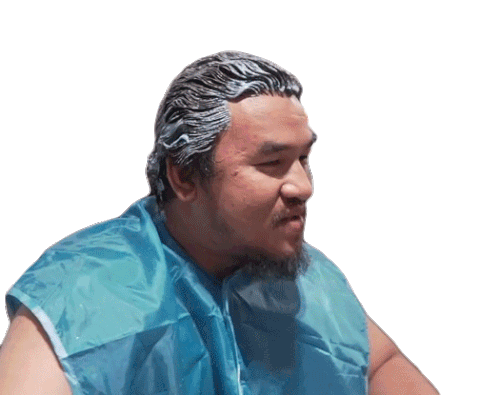 Nongmax laughs heartily with a joyful expression, hair covered in a white substance, wearing a blue smock.