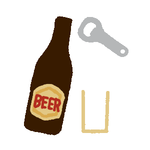 A simple drawing of a beer bottle with a 'BEER' label, a glass of foamy beer, and a metal bottle opener, ready for a drink.