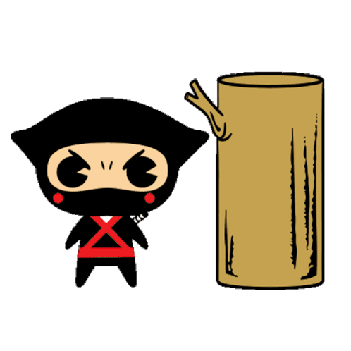 An angry cartoon ninja with a red X on his chest chops a wooden log with a swift, powerful strike.