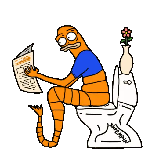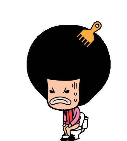 A cartoon character with a large afro struggles with constipation on the toilet, then finds relief.