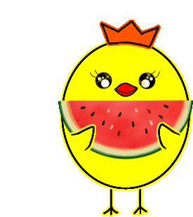 Piyomi the cute yellow chick, wearing a crown, happily eats a slice of refreshing watermelon.