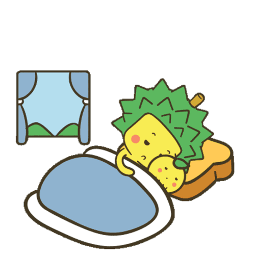 A cute Durein Durian cartoon character wakes up in bed as the sun rises, with 'MORNING' appearing. Perfect for a cheerful start to the day.