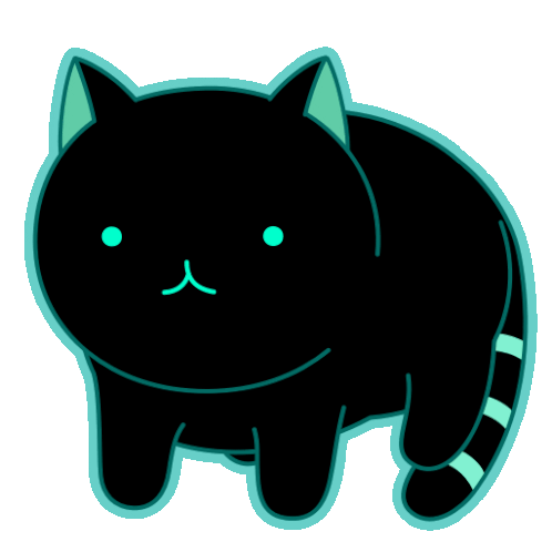 A cute, chubby black cartoon cat with glowing cyan features rolls playfully in this animated sticker.