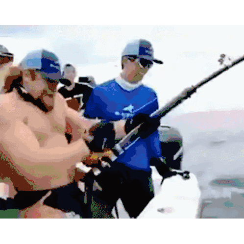 Men fishing on a boat, holding a 'Shabbat Shalom' sign with traditional Jewish symbols like challah, candles, and a kiddush cup.