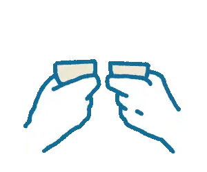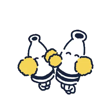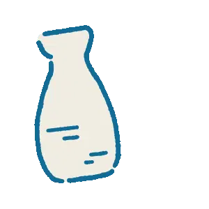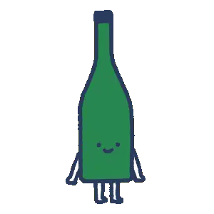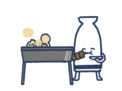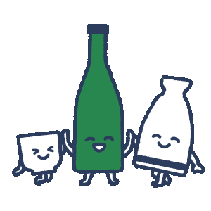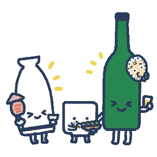 A cute animated sticker featuring a green sake bottle and two white cups with expressive faces, standing together.