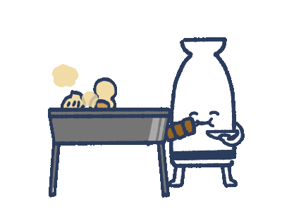 A cute cartoon sake bottle, labeled 'Junmai', happily holds a skewer of food.