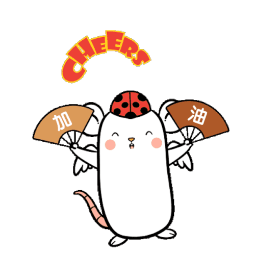 A cute white mouse-like creature with a ladybug hat, holding fans with Chinese characters "加油" (Go!), jumping happily with "CHEERS" above.