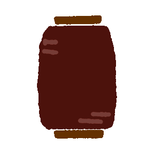 A traditional Japanese sake barrel, known as a 'junmai nihonshu' barrel, with two wooden handles, depicted as a drawing.