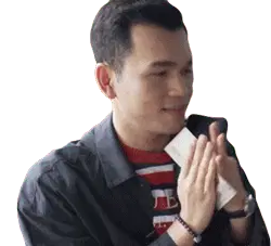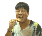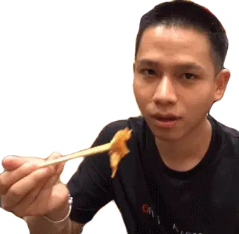 A man enthusiastically eats a piece of food, reacting with a satisfied expression and clapping his hands, conveying deliciousness and enjoyment.