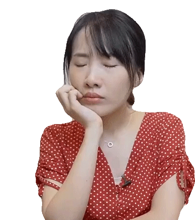 softpomz, a woman in a red polka dot dress, looks surprised and startled, resting her chin on her hand.