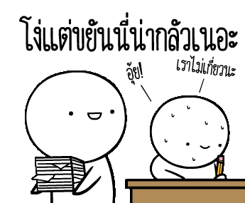 Two round-headed cartoon characters, one diligent with papers, the other stressed, with the Thai caption "Stupid but diligent is scary, isn't it?".