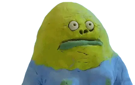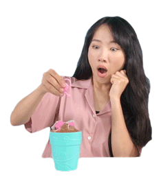 Softpomz reacts with wide-eyed surprise and an open mouth as she pulls a small pink toy from a blue pot.