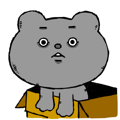 A cute grey bear character in a cardboard box looks around with a surprised '二度見 えっ' expression.