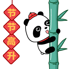 A cute panda in a red hat climbs a bamboo stalk, with '节节高升' (rising steadily) text for Chinese New Year.