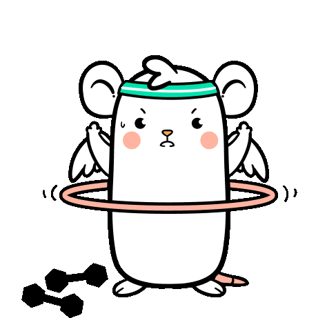 Chow Hon Lam's Flying Mouse365 character hula-hooping with dumbbells nearby, showing effort during a fitness workout.
