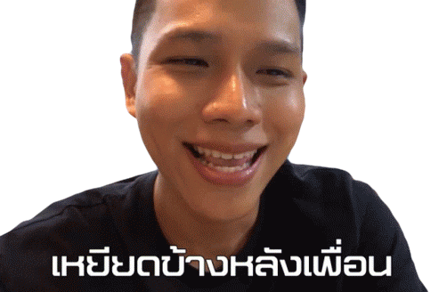 A person smiles, then looks sideways with a mischievous expression, featuring Thai text 'เหยียดข้างหลังเพื่อน' (Insulting behind a friend).