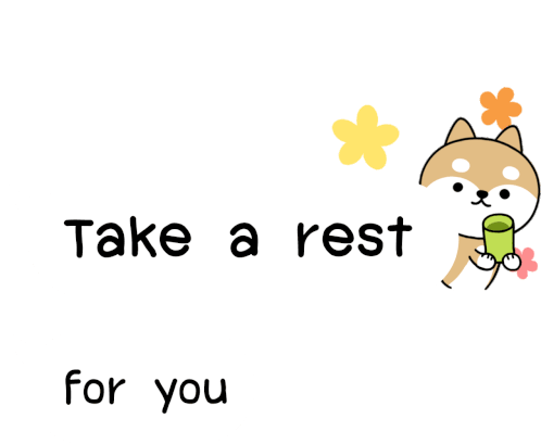 A cute Shiba Inu dog peeks out, offering a cup of tea and encouraging you to 'Take a rest' and 'for you'.