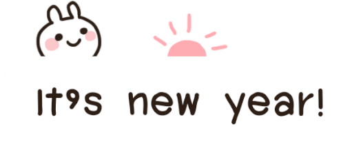 A cute rabbit character, Mimi, celebrates the New Year with a cheerful message and a rising sun.