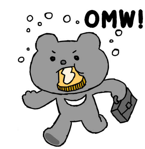A frantic grey cartoon bear runs with toast in its mouth and a briefcase, exclaiming "OMW!", indicating it's late and rushing.
