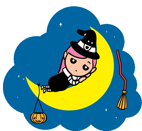 A cute witch with pink hair is peacefully sleeping on a crescent moon, with a pumpkin lantern and broomstick nearby.