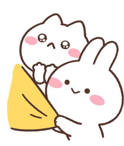 Animated sticker of a cute white rabbit pulling a reluctant white cat with a yellow blanket, expressing 'Take me with you'.