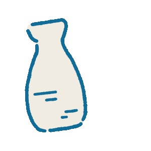 A stylized illustration of a traditional Japanese sake bottle (tokkuri) and a small cup (ochoko), with sparkling stars.