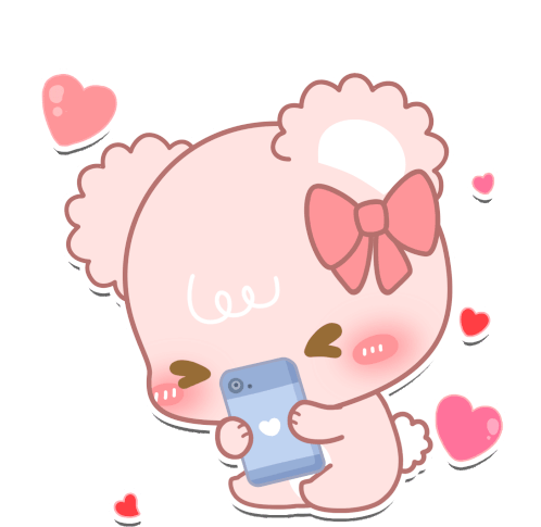 A cute pink Sugar Cubs bear with a bow, blushing and holding a phone, surrounded by hearts, feeling happy and in love.