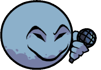 The FNF Cheeky Mod character, a light blue smiling face, holds a microphone ready to rap in Friday Night Funkin'.