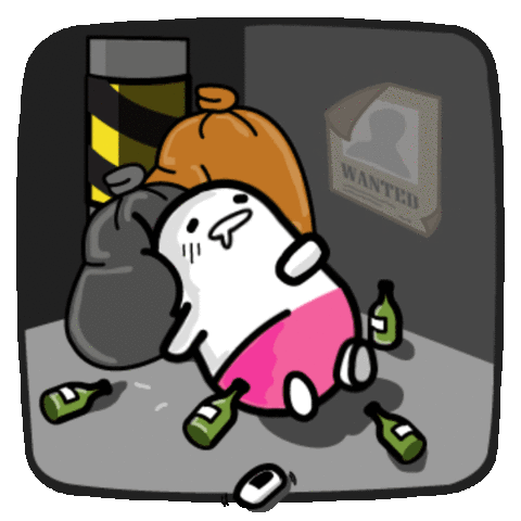 A cartoon character, appearing stinking soused, lies amidst empty bottles and trash bags, with a wanted poster nearby.