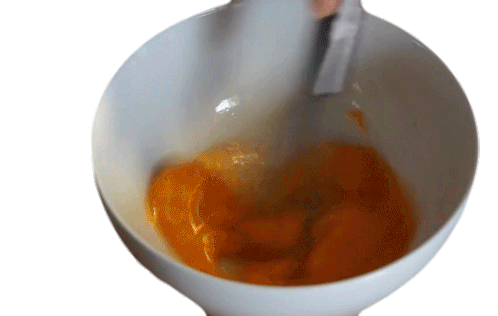 A whisk rapidly stirs bright orange egg yolks in a white bowl, preparing them for cooking.