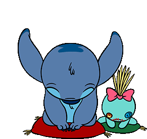 Stitch, the blue alien character, sits on a red cushion, bowing his head next to a teal voodoo doll on a green cushion.
