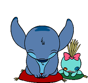 Stitch appears triste and sleepy, sitting on a red cushion alongside Scrump on a green cushion, conveying a melancholic mood.