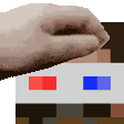 Stoneminer's pixel art hand, wearing a blue sleeve, reaches out towards a distinctive red and blue block, reminiscent of building games.