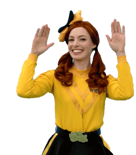 Emma Watkins from The Wiggles raises her hands, signaling to stop or wait. A cheerful and expressive sticker.