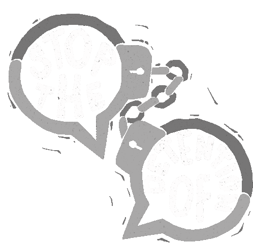 Stylized animation of handcuffs shaped like speech bubbles, with text 'STOP MBS' and 'SAVE JOURNALISM', protesting detention in Saudi Arabia.