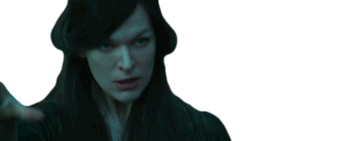 Milla Jovovich as Nimue from Hellboy 2019, making a 'stop' or 'wait' gesture while casting a spell.