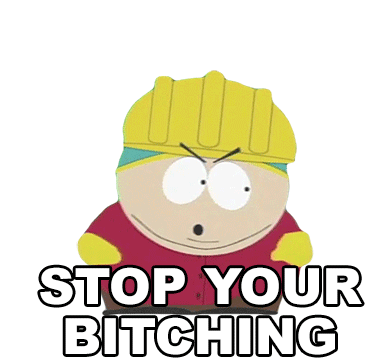 Eric Cartman from South Park, wearing a hard hat, angrily tells someone to 'Stop Your Bitching' in this animated sticker.