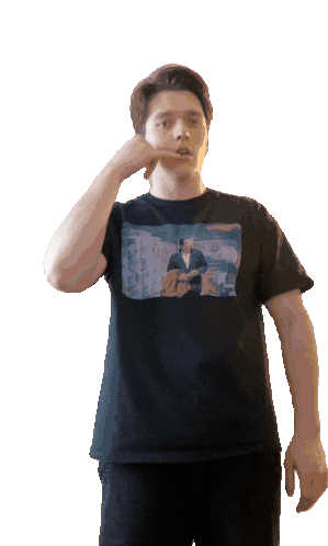 Stopick Tolkunov makes a 'call me' gesture, wearing a black t-shirt with a graphic print.