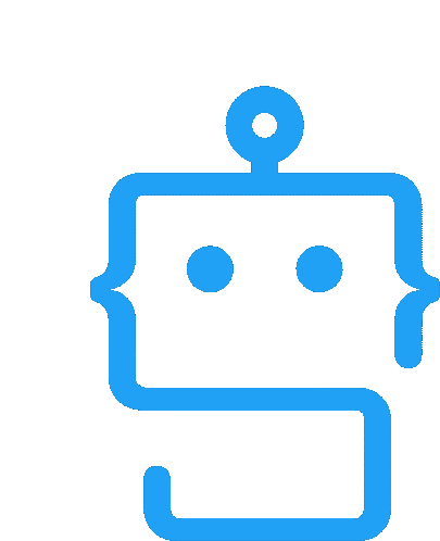 A blue robot icon, resembling a coding symbol with curly braces and a semicolon, featuring a lightbulb for an idea.