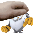 a cartoon character with yellow gloves is being held up by a person 's hand .