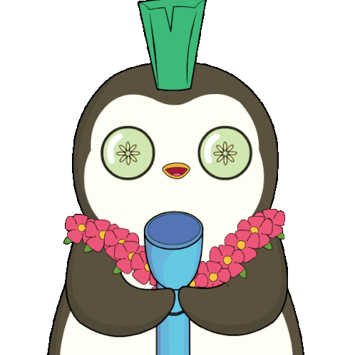 A cute Pudgy Penguin with cucumber eyes and a lei holds a flashlight, setting a cozy mood for story time.