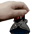 An animated pixel art sticker featuring Stratosphear's character Roni (also known as Ronnie or R Onopoldo) being held by a hand.