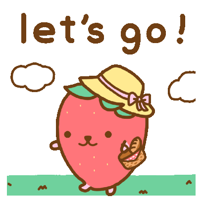 A cute animated strawberry character wearing a hat and carrying a picnic basket, ready to go on an adventure.