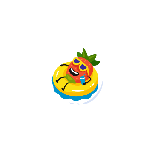 A cheerful strawberry character from Toy Kingdom floats happily in a yellow ring, enjoying a refreshing summer drink.