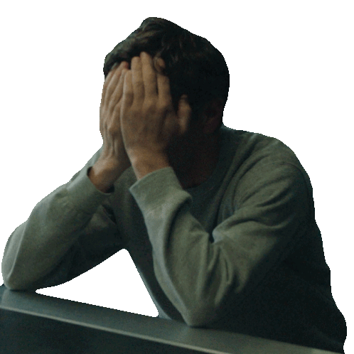 Elliot Ward, looking stressed and troubled, covers his face with his hands in a moment of despair.