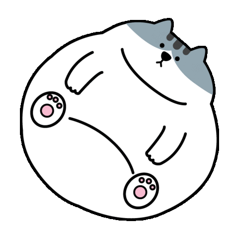 A cute, round cartoon cat with gray patches on its head is stretching or doing a yoga pose, wiggling playfully.