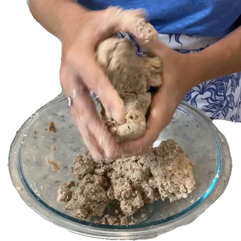 Jill Dalton's hands are shown vigorously kneading and stretching a light brown dough in a clear glass bowl, preparing it for a plant-based recipe.