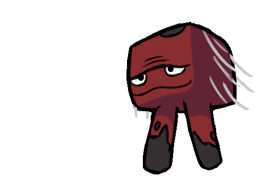 An animated Minecraft Strider, a red block-like creature with black legs and white hair, walks with a melancholic or indifferent expression.