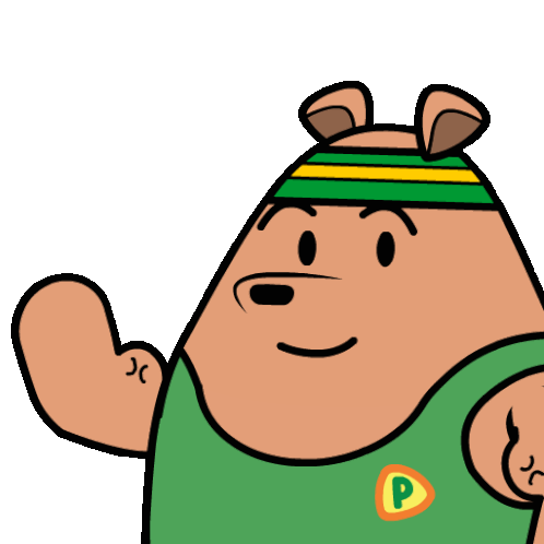 A cartoon bear with a green shirt flexes its bicep, showing off its strong muscles with determination.