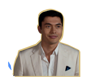 Henry Golding as Nick Young makes a confident grand entrance, smiling with animated lines swirling around him.